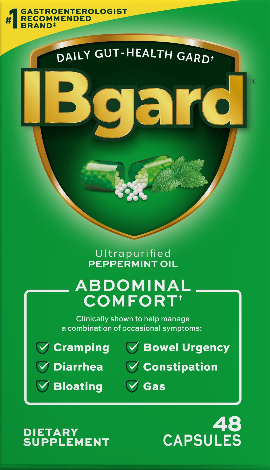 IBgard® capsules are clinically shown to help manage a combination of occasional symptoms, including cramping, diarrhea, bloating, bowel urgency, constipation, and gas.†